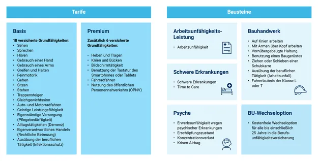Die Hannoversche Grundfähigkeitsversicherung besteht aus zwei leistungsstarken Tarifen: Basis und Premium. Der Basis-Tarif leistet bei Verlust von 18 elementaren Grundfähigkeiten. Im Premium-Tarif sind weitere 6 Grundfähigkeiten versichert. Darüber hinaus bietet unsere Grundfähigkeitsversicherung sinnvolle zusätzliche Bausteine. Mit diesen leistet die Grundfähigkeitsversicherung auch bei weiteren Ereignissen, z.B. bei schweren Erkrankungen oder Arbeitsunfähigkeit.