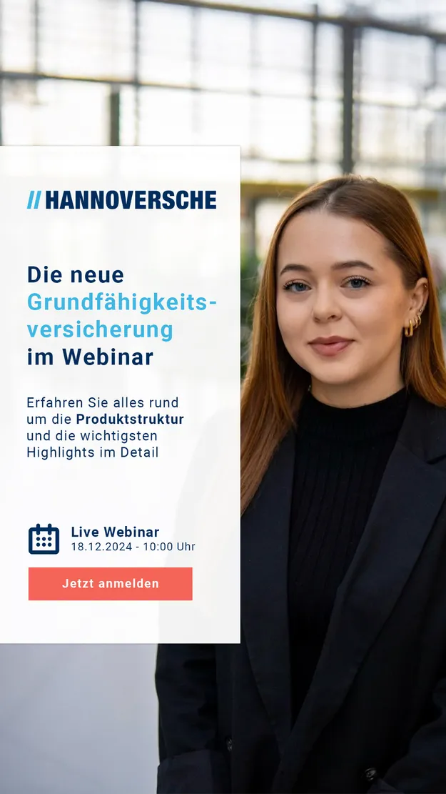 Nehmen Sie an unserem Live-Webinar am 18.12.2024 um 10 Uhr teil und erhalten Sie exklusives Insider-Wissen über die neue Grundfähigkeitsversicherung der Hannoversche: